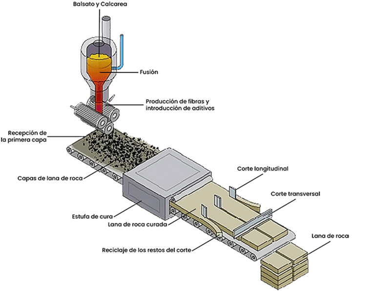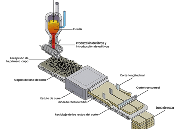 La lana de roca es un aislante térmico, acústico e incombustible, que es el resultado de un proceso de transformación física entre la fusión del Basalto a altas temperaturas, así como el consiguiente proceso de centrifugación de la masa fundida, que genera las fibras minerales.